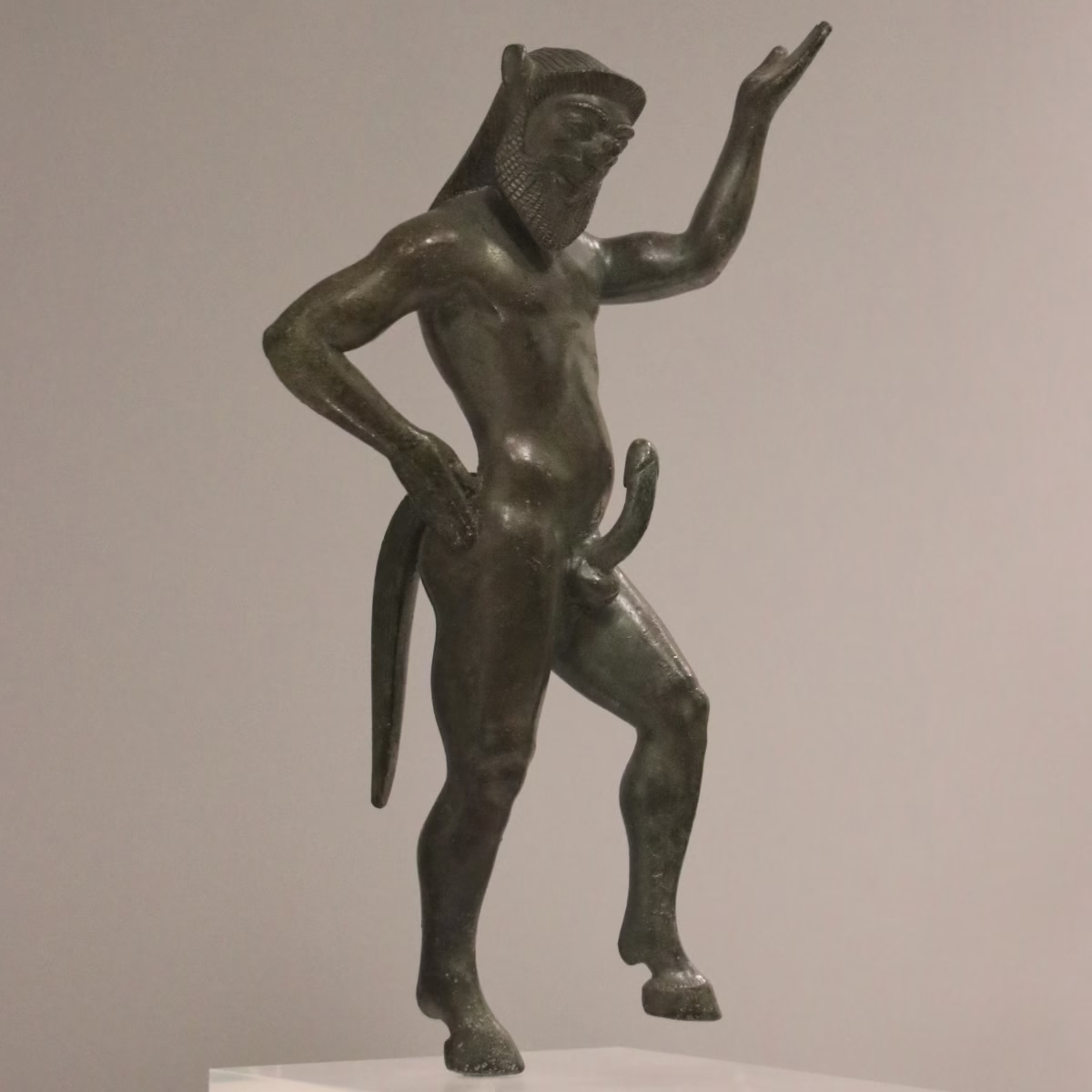 Nearby, but much older, is the Statuette of an Ithyphallic Dancing Silen, ca. 540-530 BCE from a Corinthian workshop. He has the features of a man and a horse, including, of course, a rather prominently displayed, outsized erection. It would have been smut if it weren’t this old, but it is interesting to know that the endless garish copies on sale in many souvenir shops in Athens are actually based on a real Greek bronze original from antiquity.