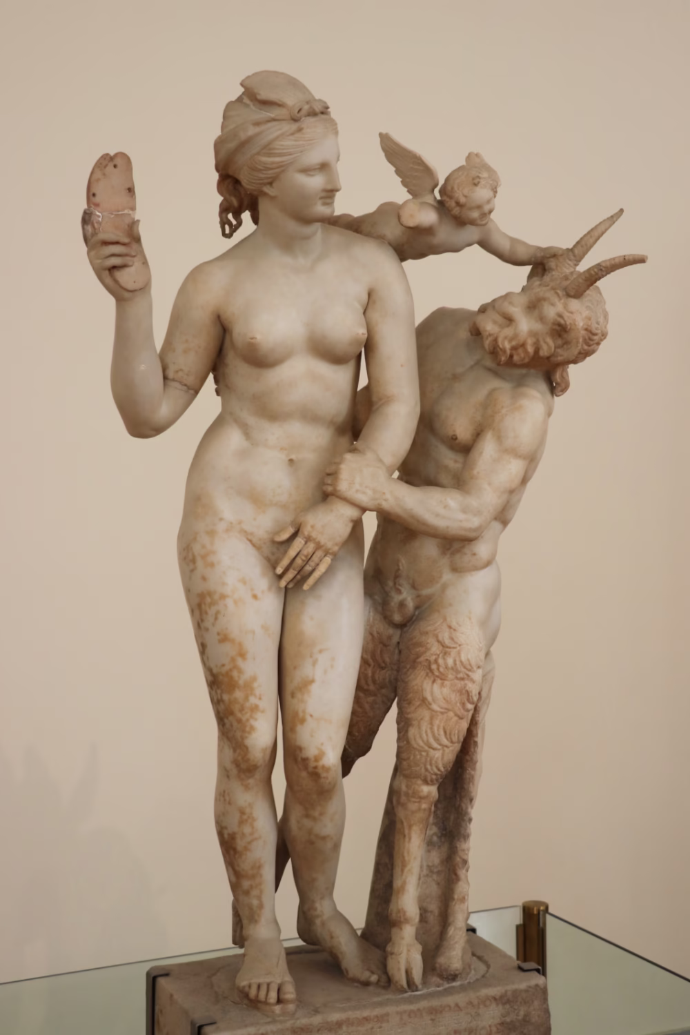 A particularly popular Hellenic Period sculpture in the National Archaeological Museum of Athens is the marble group of Aphrodite, Pan, and Eros, from Delos, Cyclades, ca. 100 BC. The sculpture is preserved with its base, with the inscription that Dionysios of Beryttos dedicated the group to his ancestral gods. The nude goddess Aphrodite attempts to fend off the goat-footed god Pan, who makes erotic advances to her. She holds her sandal threateningly in her right hand, while the winged god Eros comes to her aid. It was a free-standing sculpture that could be admired from any angle. Height with the base 1,55 m (5 ft).