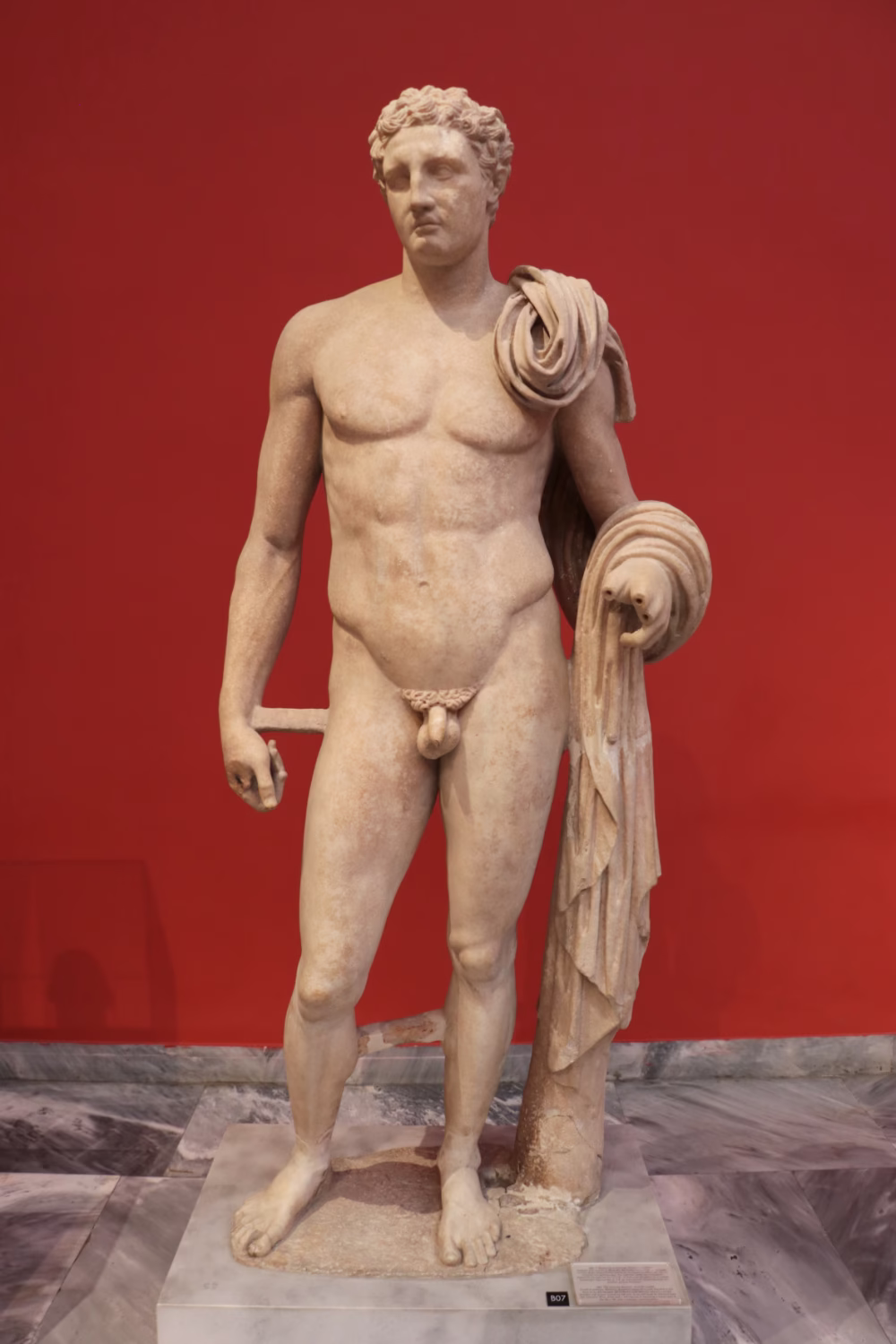 The Pentelic marble Atalante Hermes with Lysippean characteristics. The funerary statue of a youthful Hermes shows the god in the nude with his chlamys over his shoulder and wound around his left arm. It was found at Atalante, Phthiotis.