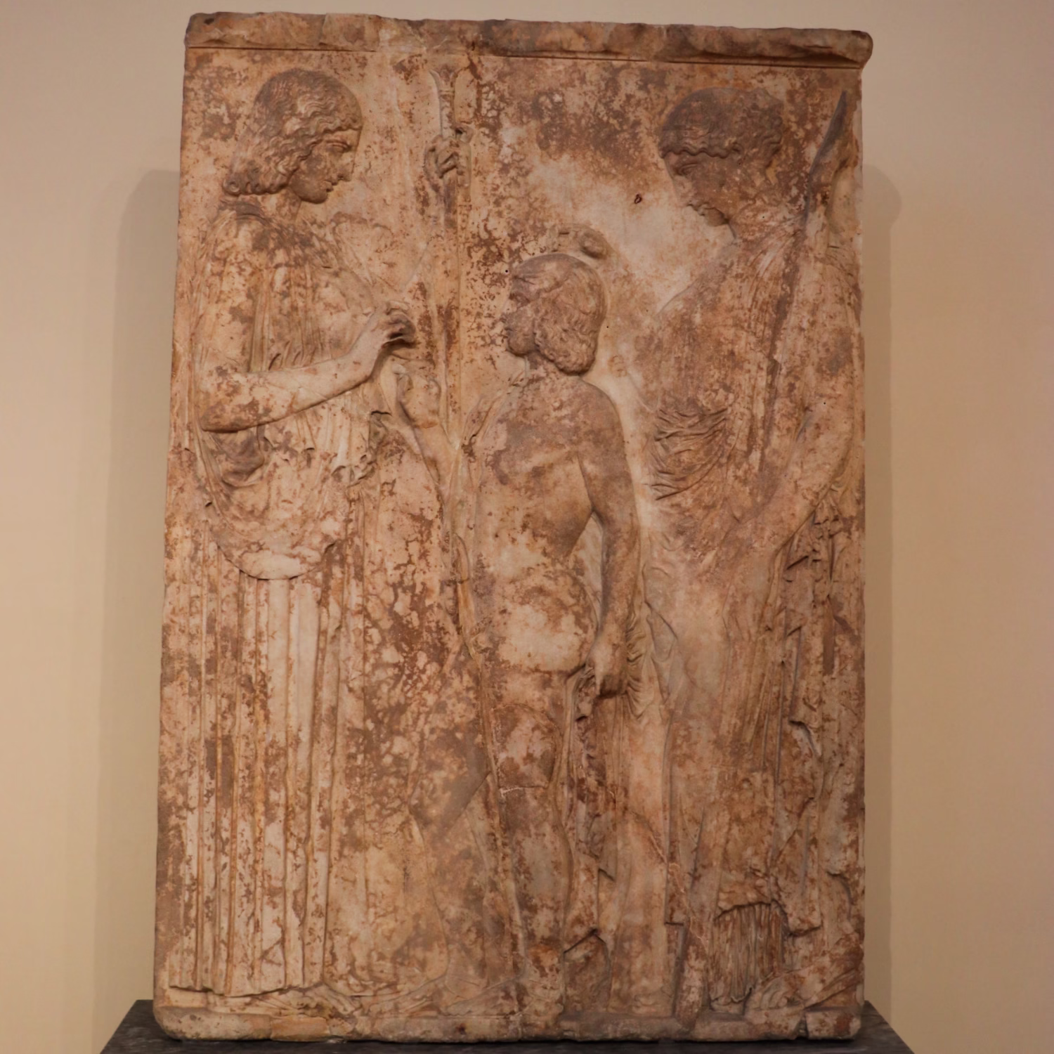 The Big Eleusinian Relief, found at Eleusis, Attica, ca. 440-430 BC, is the largest and most significant votive relief surviving from Greek antiquity. Dedicated to the sanctuary of Demeter and Kore at Eleusis, it represents the Eleusenian deities in a scene of mystic ritual. Demeter offers ears of wheat to the hero Triptolemos, son of the Eleusenian king Keleos, to bestow food on mankind. Persephone blesses Triptolemos with her right hand. (A Roman copy is in the Metropolitan Museum of Art, in New York.) Pentelic marble. Height 2,20 m., width 1,52 m (ca. 7’2″ by 5′).