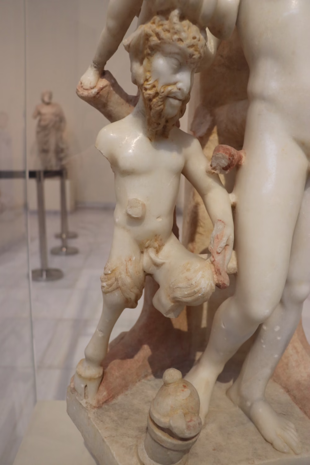Marble table support with a Dionysiac motif, around AD 170-180, was the single support for a table top. The pillar-support is adorned by a group of Dionysos, Pan and a Satyr. The nude Dionysos holds a rhyton (ritual vase). Next to him the goat-footed god Pan holds a lagobolon (stick to throw at hares). In front of them is a small cylindrical basket, from which a snake is emerging. A young Satyr climbs up the vine and cuts grapes with the sickle in his right hand. From the branch hangs a lagobolon, Pan’s syrinx (pipes) and a goatskin. The exposed parts of the bodies are very well polished.