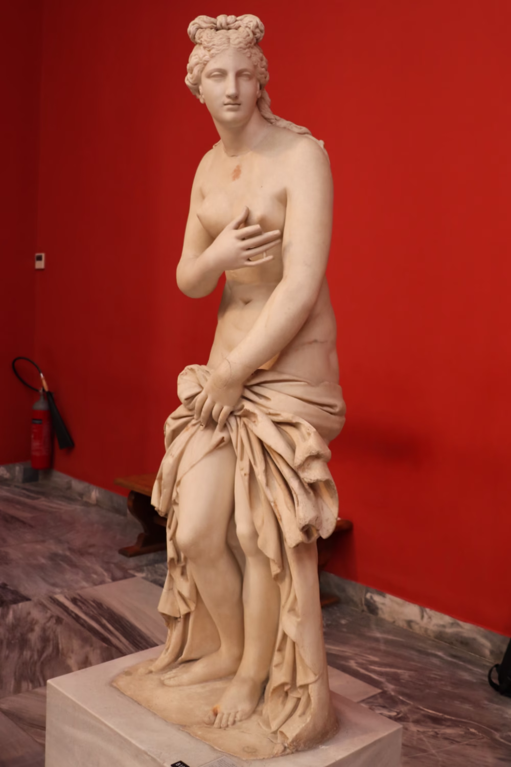 A Parian marble Statue of Aphrodite found at Baiai in southern Italy. Aphrodite is depicted standing, nude save for a richly draped himation which she retains with her left hand in front of her pudenda. The neck, head, and right arm were restored by Antonio Canova (1757-1822)