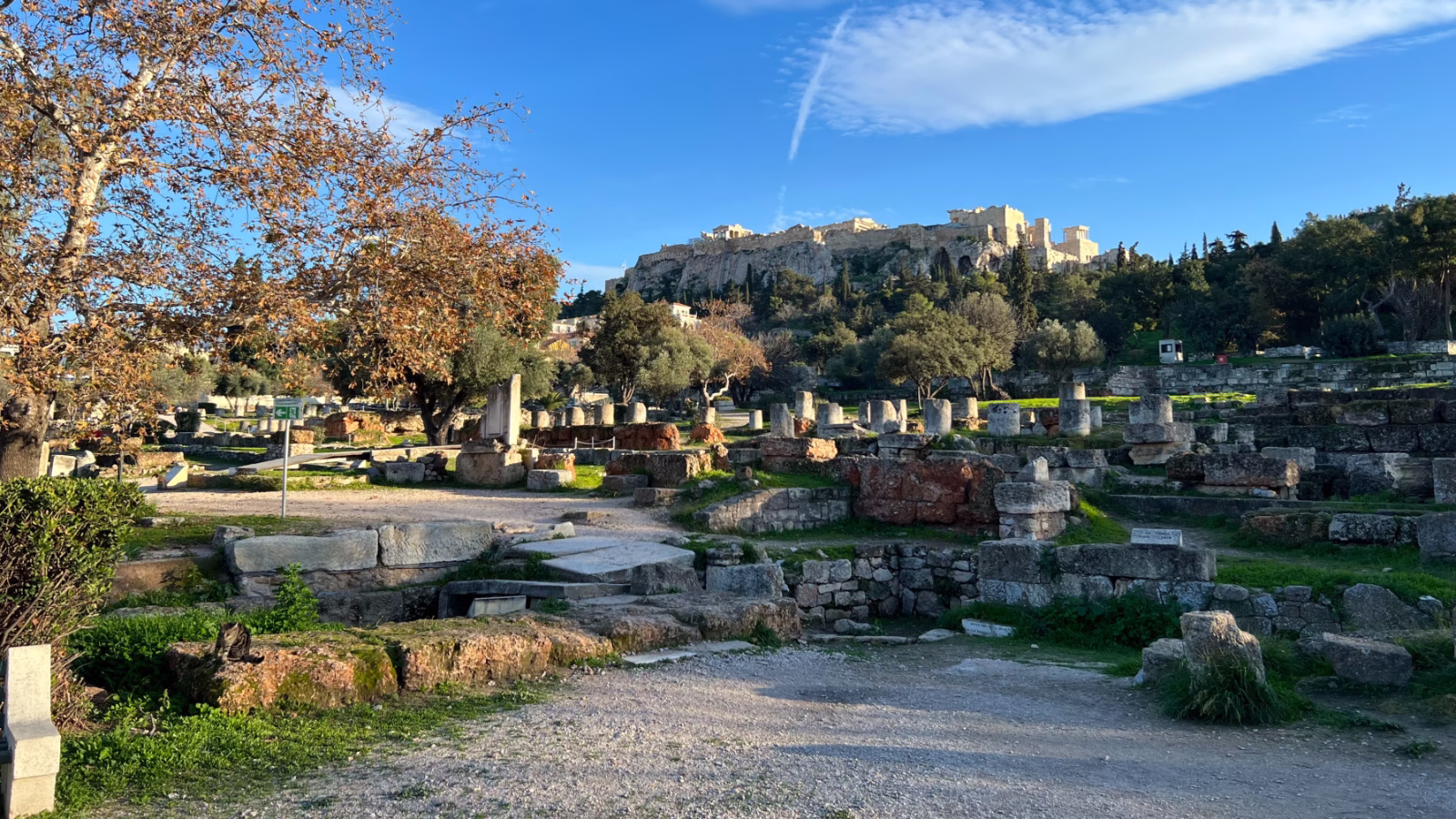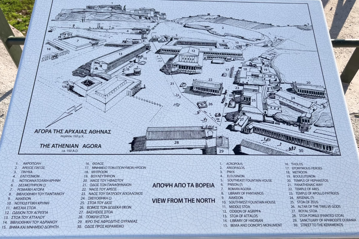 The Ancient Agora of Athens archaeological site is to the north of the Acropolis Hill. The entrance is via a bridge across the railway line that cuts through parts of the site.