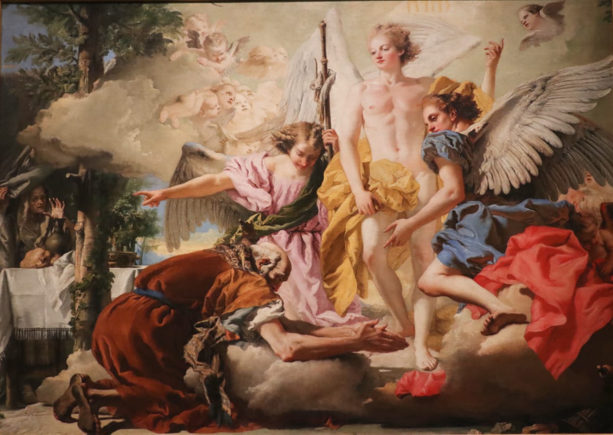Giandomenico Tiepolo: The Three Angels Appearing to Abraham (Apparizione dei tre angeli ad Abramo). Hinting at the neo-Classical with the angel’s body inspired by the Apollo Belvedere.
