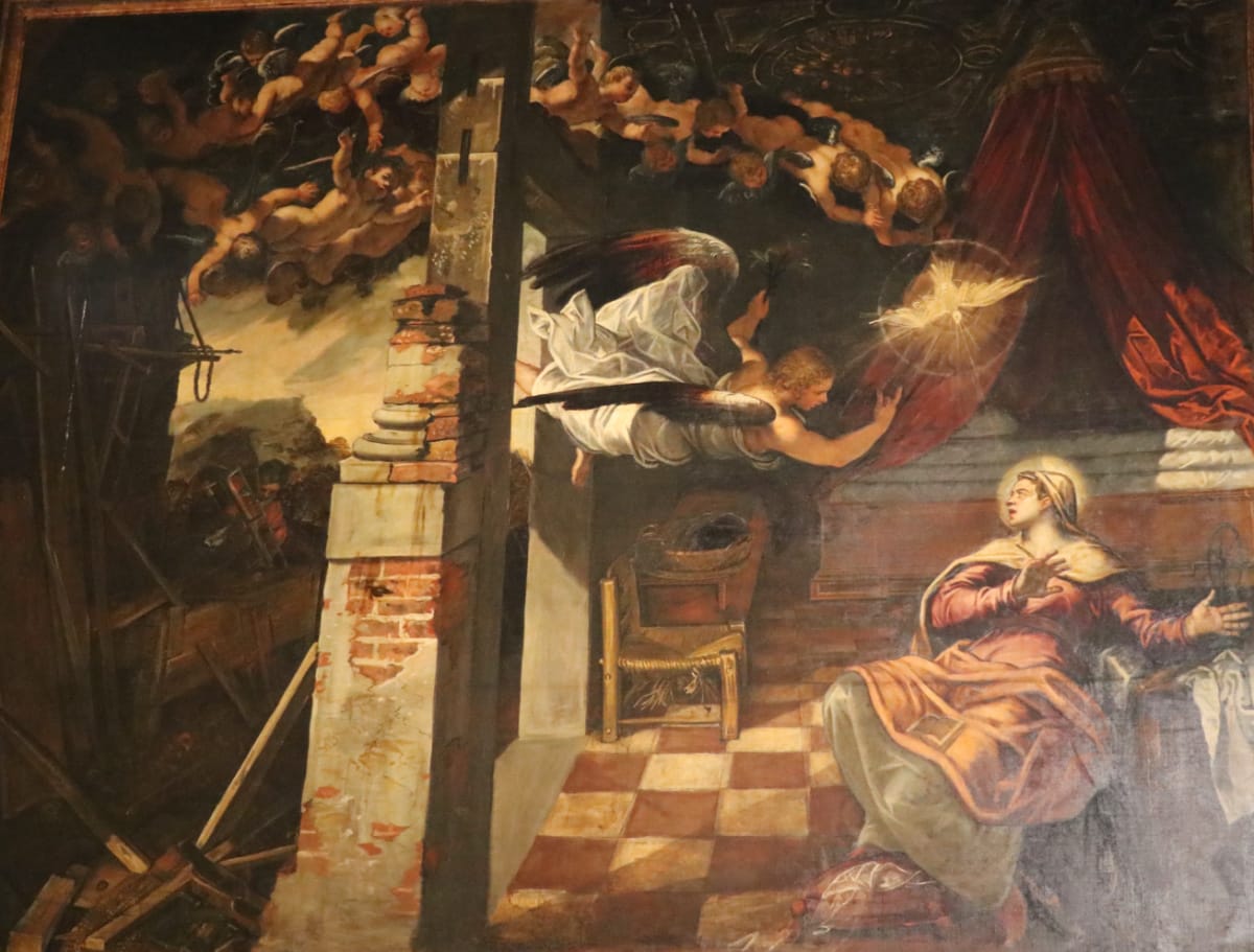 Rather than following the Bible in simple sequence, Tintoretto created a sweeping panorama that connects Old Testament prophecy, New Testament events, the Passion of Christ, and the life of the Virgin Mary. His paintings burst with energy, dramatic perspective, and radiant light breaking through deep shadow.