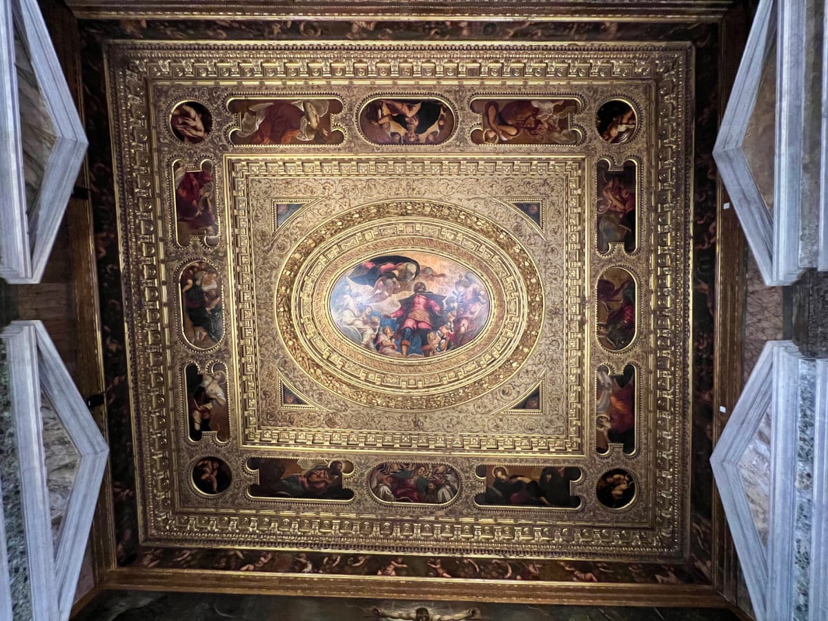 Tintoretto also painted the ceiling paintings of allegorical figures, and in the center, St Roch in Glory.